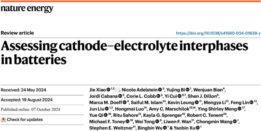 Xiao, J., Adelstein, N., Bi, Y. et al. Assessing cathode–electrolyte interphases in batteries. Nat Energy (2024).