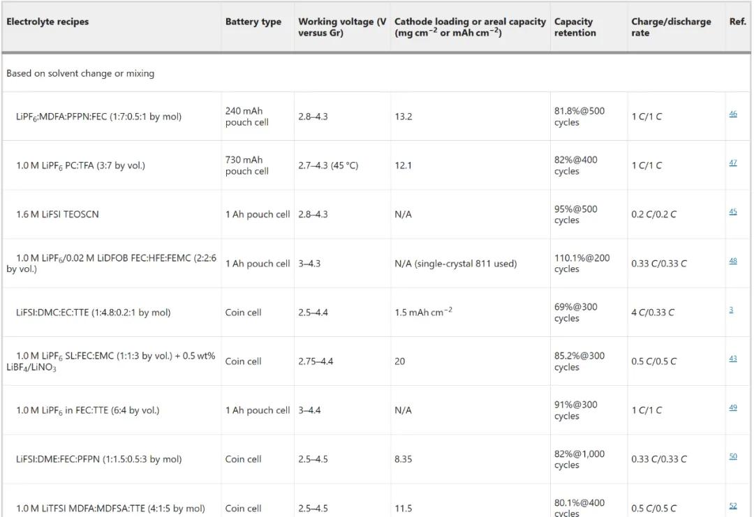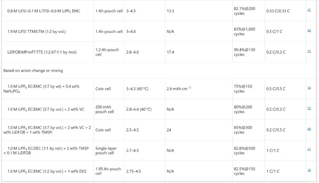 表2 NMC811 在以石墨为阳极的纽扣/软包锂离子电板中的功能电解质。