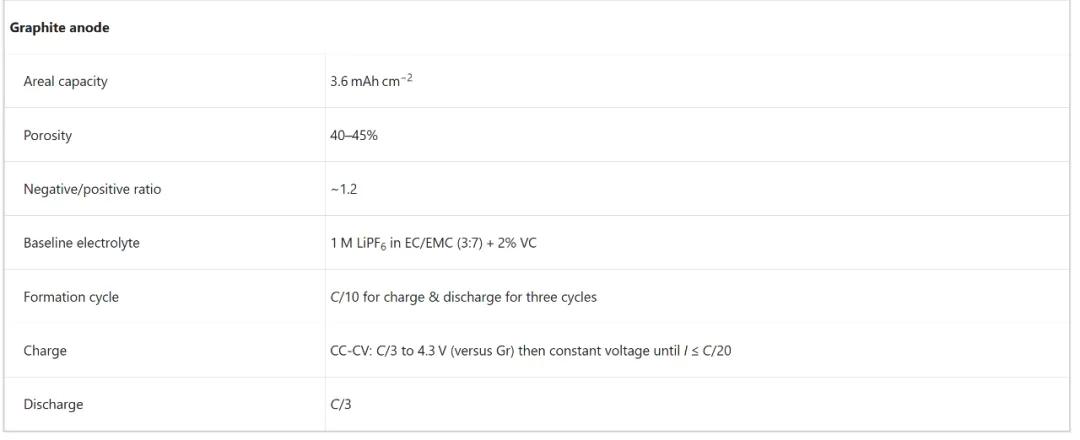 接下来盘问了在评估CEI对电板宏不雅性能影响时所需的揣测条款,强调了确保界面气候在实质电板中证据主导作用的要紧性。电板性能频频由最慢才略或最劣因素决定,因此不雅察到的电化学性能不是由CEI主导,其工程效力的评估将濒临挑战。固然石墨全电板适用于始终CEI评估,但其在拼装和测试经过中需规则更多参数,以确保可叠加性。因此,表 1提供了在实质电板条款下构建和测试全纽扣电板所需的要津参数列表。此外,针对不同应用场景,表中提到的阴极和阳极的面积负载和孔隙率不错进一表率整,以适合高能量、高功率或快速充电系统。纽扣电板在测试经过中,电解液的过量可能导致某些CEI因素的溶化,从而为CEI的辩论增多省略情趣。因此,具有特定容量、能量或功率的软包电板更妥贴进行交叉考据。