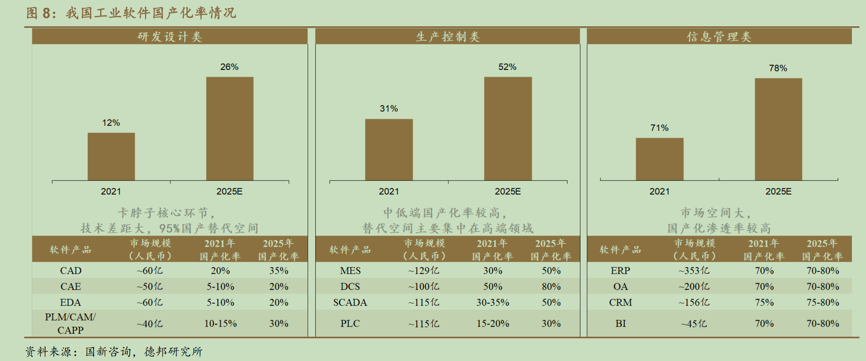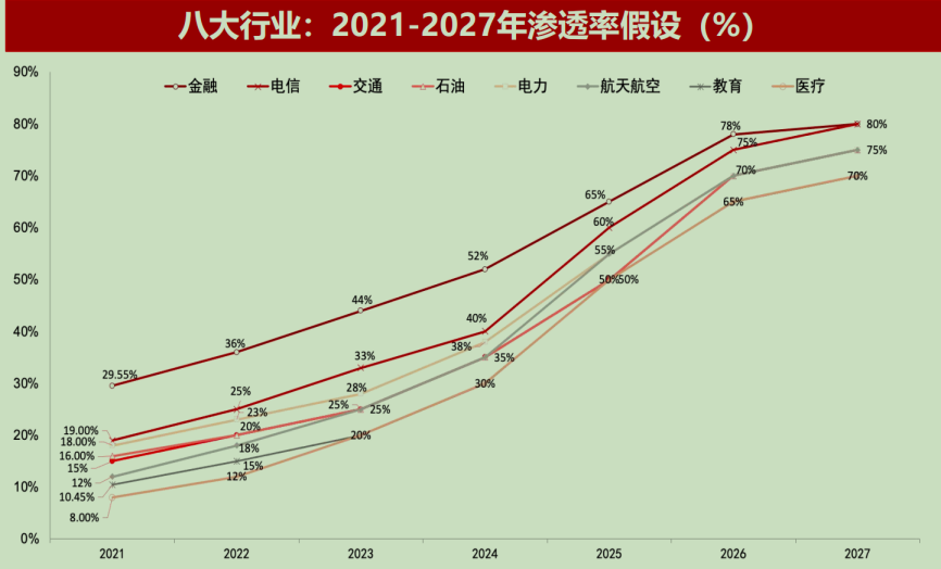 据浙江证券的统计,金融等行业的软硬件国产化率在2021年均不到20%。到2027年有望提高到70%到80%。